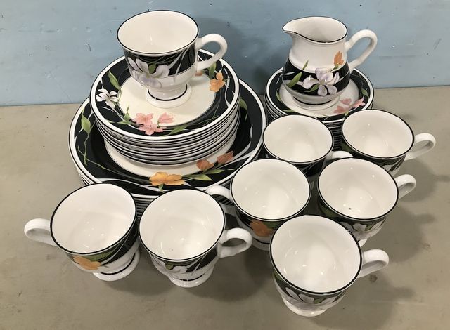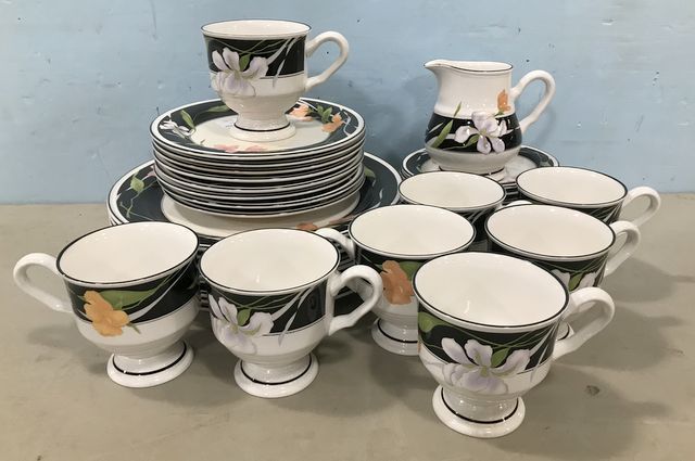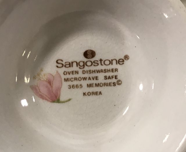Sangostone Stoneware Partail China Set, made in Korea, 8 dinner plates, 8 salad plates, 8 dessert plates, 8 cups, creamer. Sangostone Stoneware Partail China Set, made in Korea, 8 dinner plates, 8 salad plates, 8 dessert plates, 8 cups, creamer.