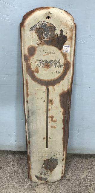 Vintage Frostie Root Beer Thermometer, has weather wear, rusted areas, faded, 36"h., 8"w. Vintage Frostie Root Beer Thermometer, has weather wear, rusted areas, faded, 36"h., 8"w.