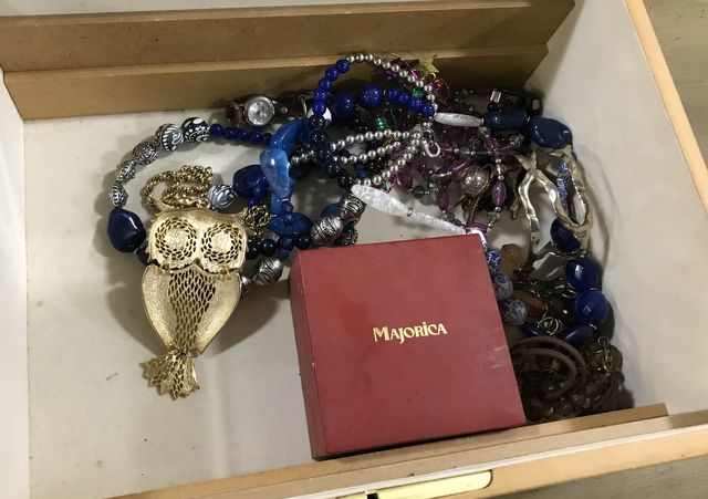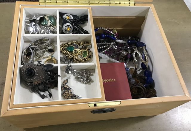 Jewelry Box with Costume Jewelry Pieces, pine mirrored jewelry box 6"h., 13"w., necklaces, bracelets, owl, and etc. Jewelry Box with Costume Jewelry Pieces, pine mirrored jewelry box 6"h., 13"w., necklaces, bracelets, owl, and etc.