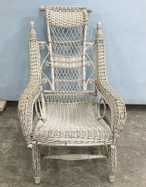 Vintage White Wicker Platform Rocker, has some age wear, 41"h. Vintage White Wicker Platform Rocker, has some age wear, 41"h.