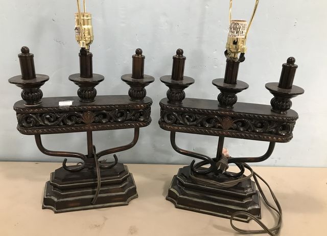 Pair of Decorative Ornate Resin Table Lamps, dark color, no shades, made in China, 24"h. Pair of Decorative Ornate Resin Table Lamps, dark color, no shades, made in China, 24"h.