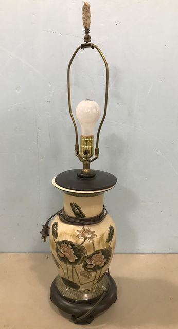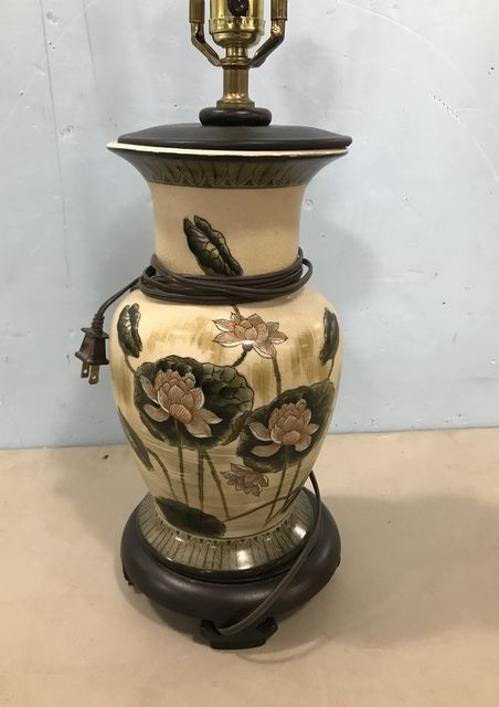 Modern ceramic convert lamp with wood top and base, hand painted flowers, 30"h. Modern ceramic convert lamp with wood top and base, hand painted flowers, 30"h.