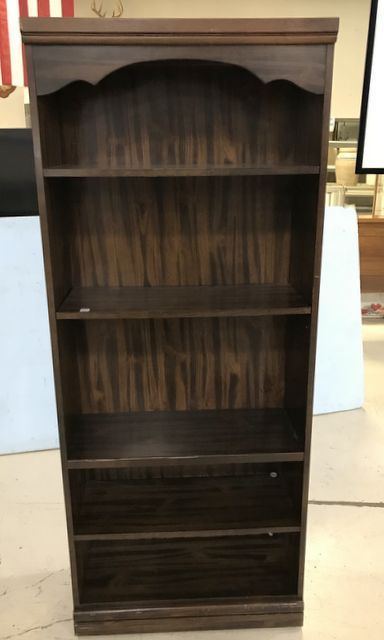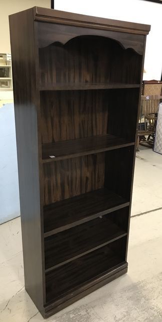 Pressed wood bookshelf, cherry finish, four shelves, cardboard back panel, 72"h., 30"w., 12"d. Pressed wood bookshelf, cherry finish, four shelves, cardboard back panel, 72"h., 30"w., 12"d.