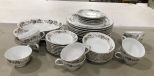 Creative Fine China Set, Japan, 11 dinner plates, 8 berry bowls, 8 saucers, 9 cups, oval platter, bowl, 5 dessert plates. Creative Fine China Set, Japan, 11 dinner plates, 8 berry bowls, 8 saucers, 9 cups, oval platter, bowl, 5 dessert plates.