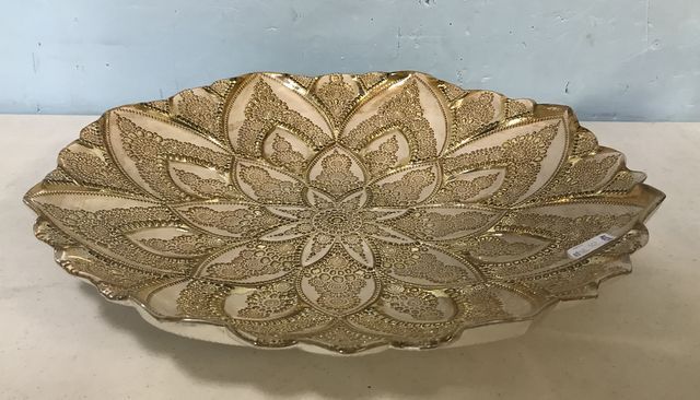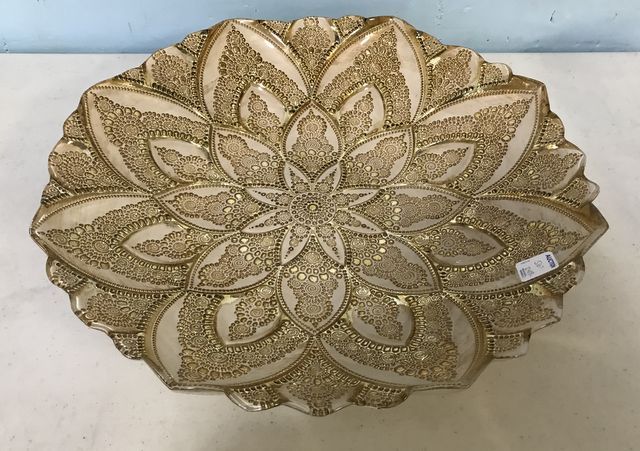 Glass decorative bowl with flower decor, gold, silver bottom, 16"dia. Glass decorative bowl with flower decor, gold, silver bottom, 16"dia.