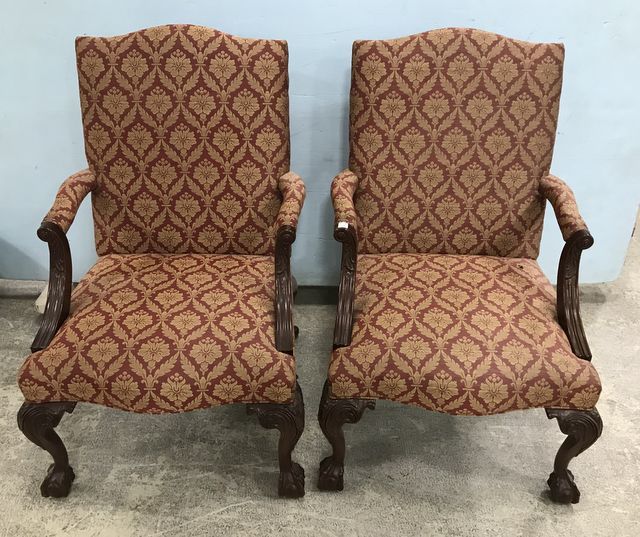 574 Pair of South Wood Ball-n-Claw Upholstered Arm Chairs