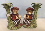579 Kaldun & Bogle Porcelain Hand Painted Monkey Candle Holders