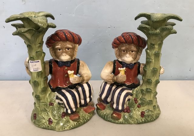 Kaldun & Bogle Porcelain Hand Painted Monkey Candle Holders, pair, 10"h. Kaldun & Bogle Porcelain Hand Painted Monkey Candle Holders, pair, 10"h.