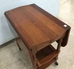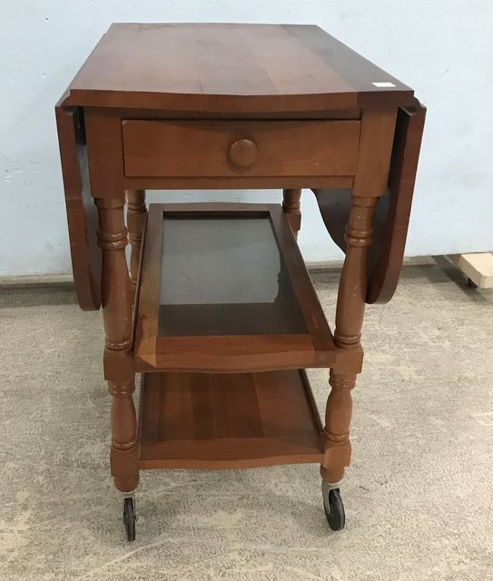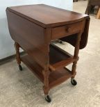 Cherry Drop Side Tea Serving Cart, two tier with serving tray, on wheels, single drawer, has wear on top, 30"h., 26"w., 17"d. Cherry Drop Side Tea Serving Cart, two tier with serving tray, on wheels, single drawer, has wear on top, 30"h., 26"w., 17"d.