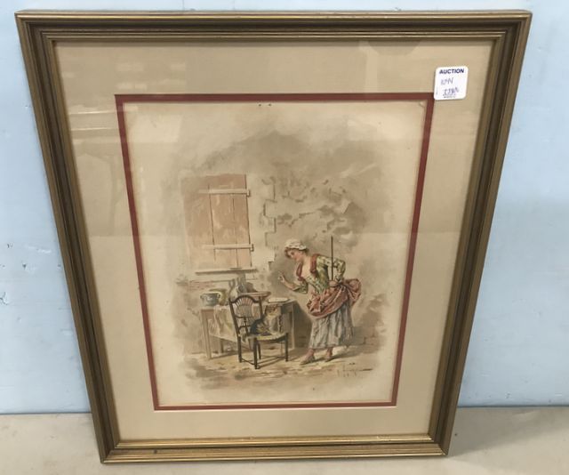 Grivaz Print of Woman and Dog, matted, framed 18"h., 15"w. Grivaz Print of Woman and Dog, matted, framed 18"h., 15"w.
