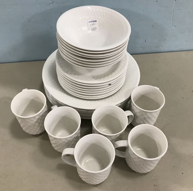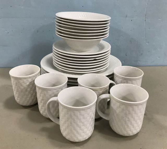 Oneida Craft Stoneware Set, white, 8 bowls, 8 desserts (one with chip), 6 dinner plates, 6 cups. Oneida Craft Stoneware Set, white, 8 bowls, 8 desserts (one with chip), 6 dinner plates, 6 cups.