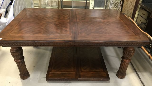 Ornate designs oak banded dinning table, inlaid trim top, large carved legs, modern decor, legs are removable, two leaves, 30"h., 72"long., 45"w. Ornate designs oak banded dinning table, inlaid trim top, large carved legs, modern decor, legs are removable, two leaves, 30"h., 72"long., 45"w.