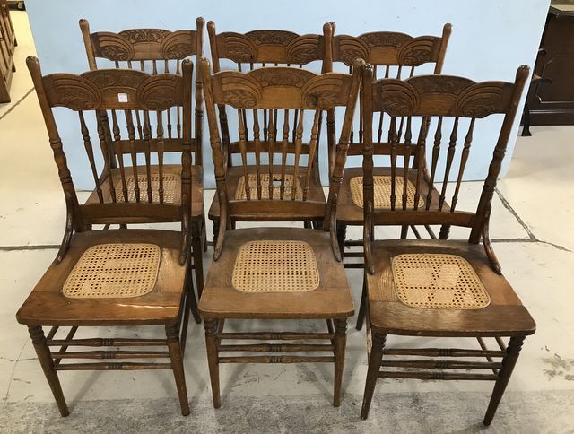 6 Vintage Oak Pressed Back Dinning Chairs, Cane seats, one is damaged, spindle back. 6 Vintage Oak Pressed Back Dinning Chairs, Cane seats, one is damaged, spindle back.