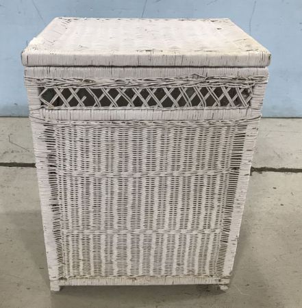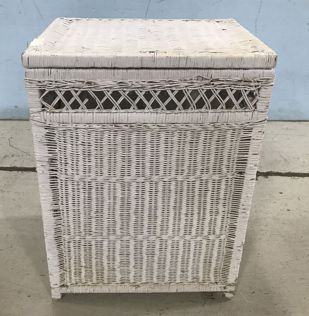 Pier 1 Imports Laundry Basket, white painted wicker, lift top, 24"h., 18"w., 14"d. Pier 1 Imports Laundry Basket, white painted wicker, lift top, 24"h., 18"w., 14"d.
