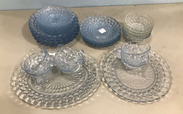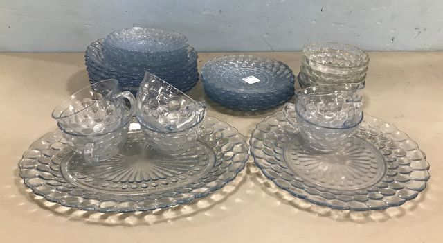 Vintage Anchor Hocking sapphire blue bubble pattern depression glass plates, platters, cups, berry bowls. 30 pieces. Vintage Anchor Hocking sapphire blue bubble pattern depression glass plates, platters, cups, berry bowls. 30 pieces.