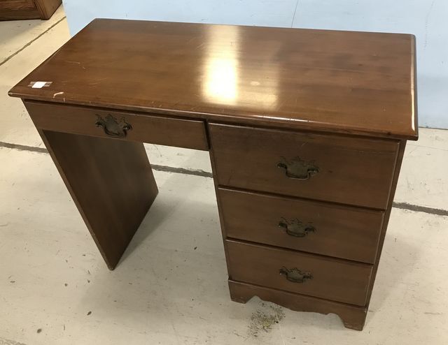 Harcraft Mahogany Kneehole Desk, four drawers, small, Early American style, does have some scratches on top, and wear on bottom, 28"h., 35"w., 15"d. Harcraft Mahogany Kneehole Desk, four drawers, small, Early American style, does have some scratches on top, and wear on bottom, 28"h., 35"w., 15"d.