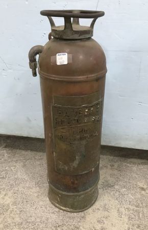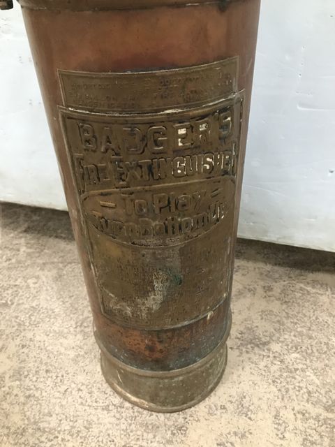 Old Badger's Fire Extinguisher, age wear, copper and brass, 24"h. Old Badger's Fire Extinguisher, age wear, copper and brass, 24"h.