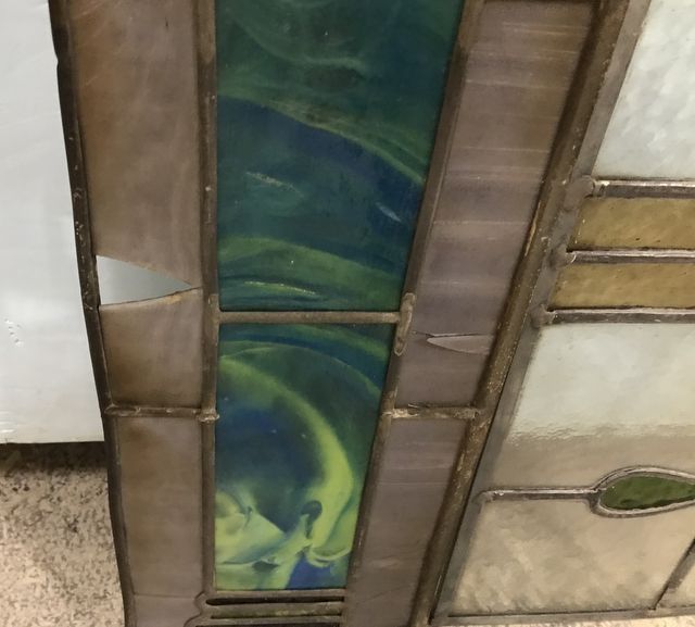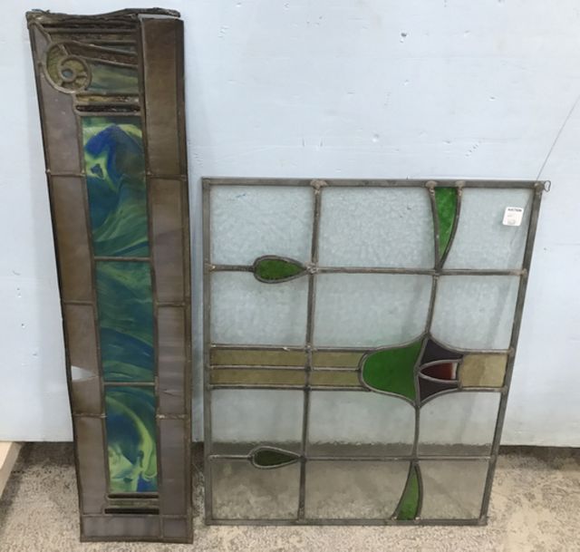 Leaded stained glass panel (has damage spots), 31"h., 7"w., and leaded stained glass panel with no cracks, 23"h., 18"w. Leaded stained glass panel (has damage spots), 31"h., 7"w., and leaded stained glass panel with no cracks, 23"h., 18"w.
