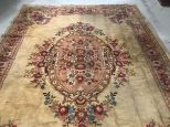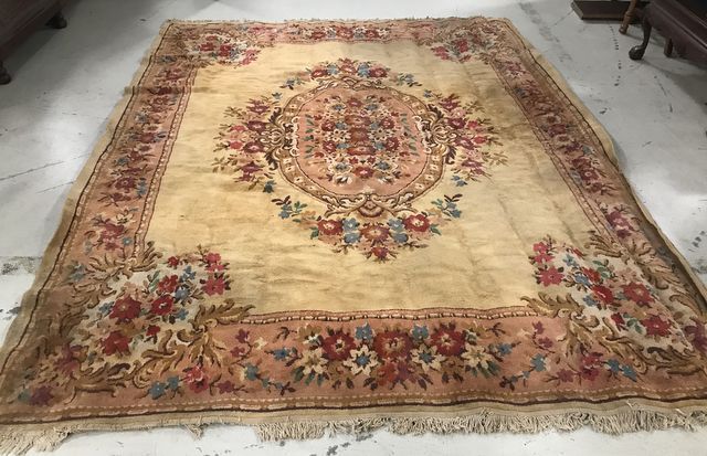 Large hand made area rug, wool, center medallion, has stains, needs cleaning, 8' x 10'8. Large hand made area rug, wool, center medallion, has stains, needs cleaning, 8' x 10'8.