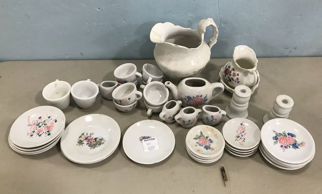 Group of Small Child's Porcelain Tea Set, pitcher, small plates. Group of Small Child's Porcelain Tea Set, pitcher, small plates.