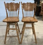 Pair of Modern Oak Pressed Back Bar Stools, swivel seats, 47"h., 30" from seat to ground, one missing front stretcher. Pair of Modern Oak Pressed Back Bar Stools, swivel seats, 47"h., 30" from seat to ground, one missing front stretcher.