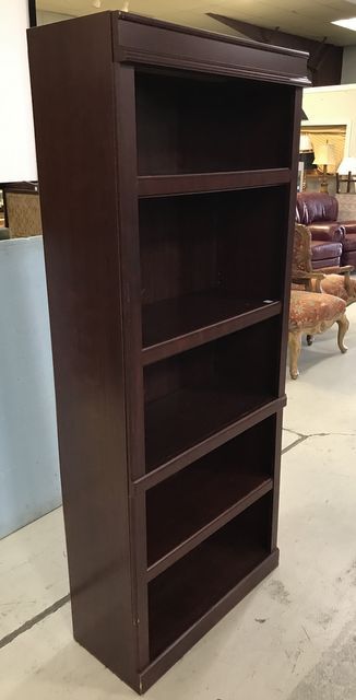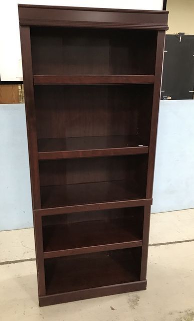 Used Cherry Pressed Board Bookcase, four shelve, has wear, 71"h., 30"w., 12"d. Used Cherry Pressed Board Bookcase, four shelve, has wear, 71"h., 30"w., 12"d.