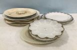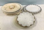 Large Group of Porcelain Platters, assorted styles, milk glass egg tray, Seville, Globe, Japan platter has chip, 12 total. Some have chips. Large Group of Porcelain Platters, assorted styles, milk glass egg tray, Seville, Globe, Japan platter has chip, 12 total. Some have chips.