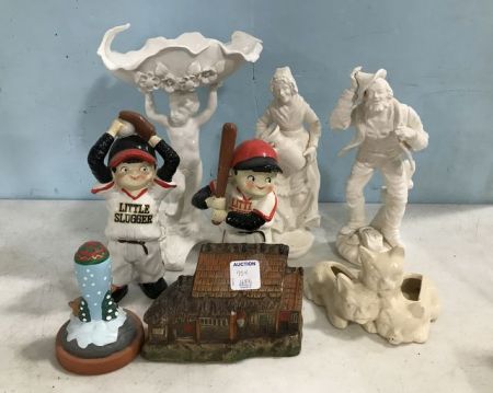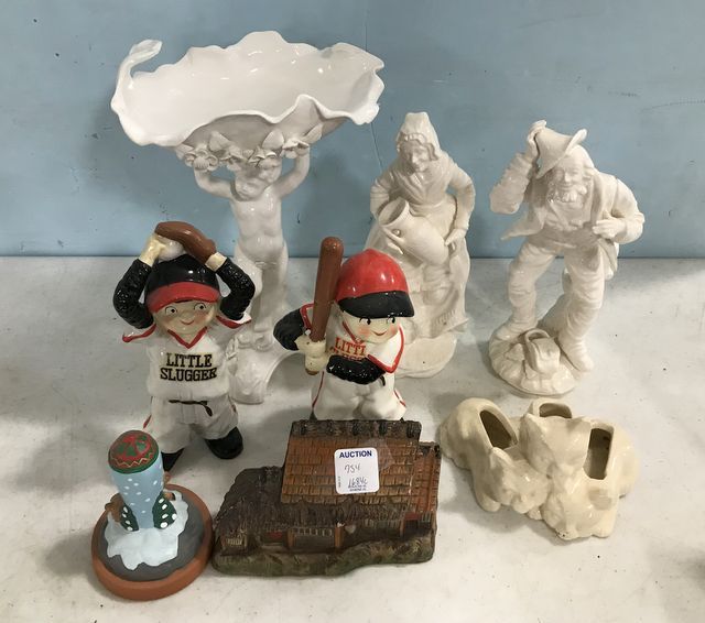 Porcelain Cherub urn, lady and man figure, cat planter, house statue, Little slugger figures. Porcelain Cherub urn, lady and man figure, cat planter, house statue, Little slugger figures.