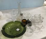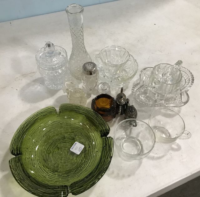 Green cigarette dish, jars, vase, sugars, salts, silver plate pitchers, cups, tooth pick holders. Green cigarette dish, jars, vase, sugars, salts, silver plate pitchers, cups, tooth pick holders.