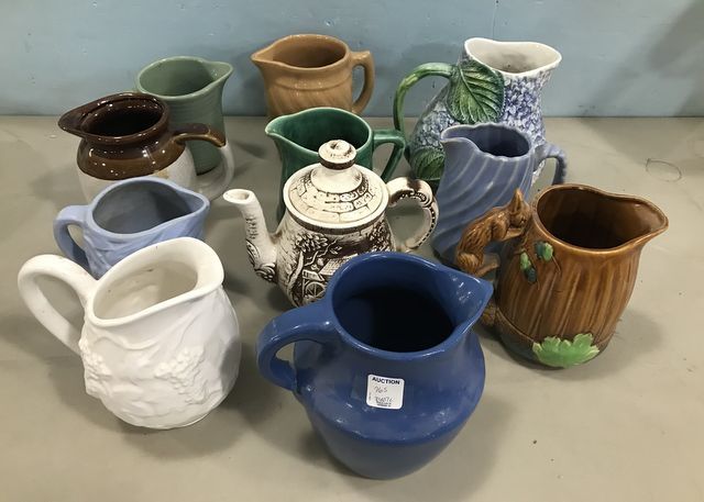 Group of Pottery and Ceramic Pitchers, Portugal, stoneware, Japanese, Monmouth, 11 total. Group of Pottery and Ceramic Pitchers, Portugal, stoneware, Japanese, Monmouth, 11 total.