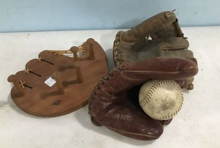 Two Vintage baseball gloves, softball, wood baseball glove wall rack. Two Vintage baseball gloves, softball, wood baseball glove wall rack.