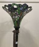 Modern Replica Slag Glass Floor Lamp, Torchiere style, twist frame, multi color replica slag glass shade, one of the screws needs work, 69"h. Modern Replica Slag Glass Floor Lamp, Torchiere style, twist frame, multi color replica slag glass shade, one of the screws needs work, 69"h.
