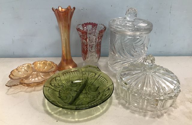 Green glass divided dish, leaf glass dish, clear glass covered candy, pressed glass cranberry vase, amber glass vase, pressed glass biscuit jar. Green glass divided dish, leaf glass dish, clear glass covered candy, pressed glass cranberry vase, amber glass vase, pressed glass biscuit jar.