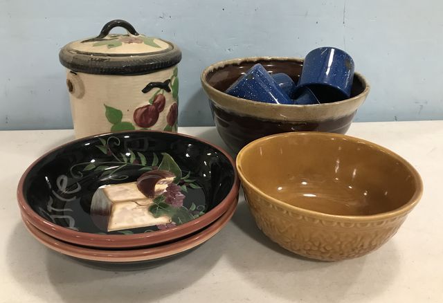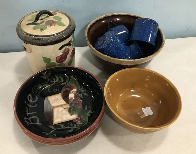Pottery bisquit jar, round stoneware bowl, blue white speckled cups, two ceramic bowls, Haeger pottery bowl. Pottery bisquit jar, round stoneware bowl, blue white speckled cups, two ceramic bowls, Haeger pottery bowl.