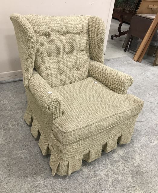 Upholstered Arm Chair, wing back, skirted, 36"h. Upholstered Arm Chair, wing back, skirted, 36"h.