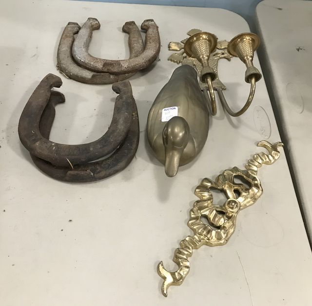 Four antique horse shoes, brass duck decoy, brass wall sconce, brass plaque. Four antique horse shoes, brass duck decoy, brass wall sconce, brass plaque.