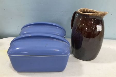 831 Two Blue Hall Pottery Container and Hull Glazed Pitcher
