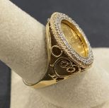 1993 American Gold Eagle 5 Dollar Coin Ring, 1/10 gold, coin set in ring with surrounding small diamonds, size is 9 1/2, band is not marked. 1993 American Gold Eagle 5 Dollar Coin Ring, 1/10 gold, coin set in ring with surrounding small diamonds, size is 9 1/2, band is not marked.