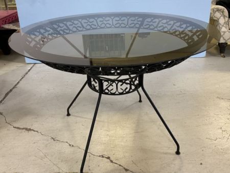 Black Painted Salterini Metal Round Table, glass top, good condition, 30"h. Black Painted Salterini Metal Round Table, glass top, good condition, 30"h.