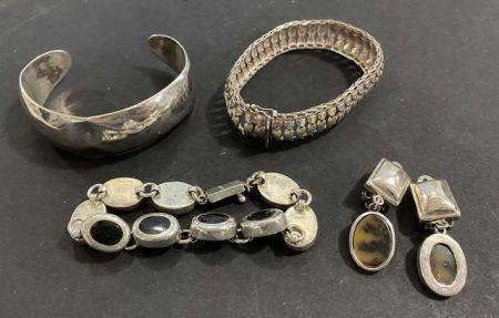 Three .925 Sterling Bracelets and Earrings, cuff bracelet, has a bend, .925 bracelet with stones, and earrings., 2.660 ozt. Three .925 Sterling Bracelets and Earrings, cuff bracelet, has a bend, .925 bracelet with stones, and earrings., 2.660 ozt.
