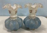 Vintage Fenton Style Blue Vases, crimped rim, floral painting, 8 1/2"h. Vintage Fenton Style Blue Vases, crimped rim, floral painting, 8 1/2"h.