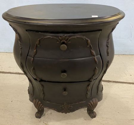 Small Black Finish Bombe Chest With French Design, three drawers, has light mildew, 27"h., 25"w. Small Black Finish Bombe Chest With French Design, three drawers, has light mildew, 27"h., 25"w.