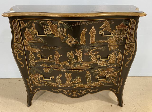 Drexel Black Lacquer Console Cabinet, oriental, three drawers, has a few scuffs and one bad spot on top, 32"h., 40"w., 16"d. Drexel Black Lacquer Console Cabinet, oriental, three drawers, has a few scuffs and one bad spot on top, 32"h., 40"w., 16"d.