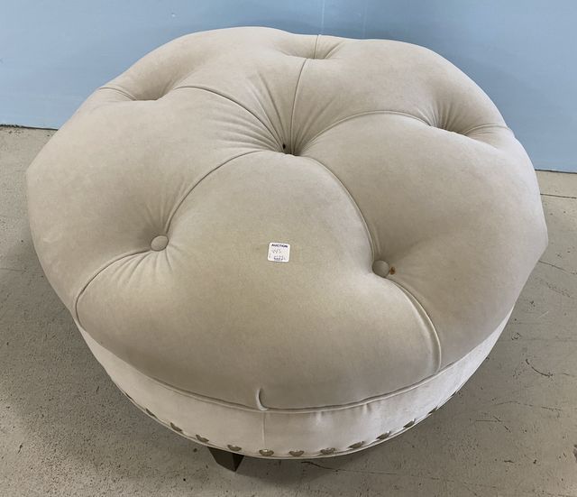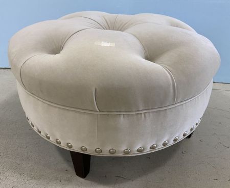 New Button Tufted Upholstered Ottoman, light dirt, 16"h., 30"dia. New Button Tufted Upholstered Ottoman, light dirt, 16"h., 30"dia.