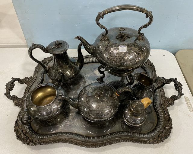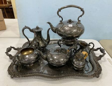 English Silver Plate Tea Service Set, pitcher, coffee pitcher, waste, creamer, footed tray, ornate, engraving, is tarnish. English Silver Plate Tea Service Set, pitcher, coffee pitcher, waste, creamer, footed tray, ornate, engraving, is tarnish.