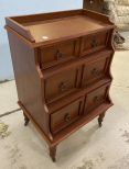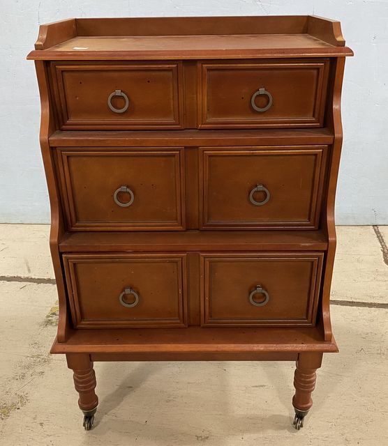 Modern Tiered File Cabinet, 6 drawers, cherry, on wheels, has light mildew, 35"h., 23"w., 18"d. Modern Tiered File Cabinet, 6 drawers, cherry, on wheels, has light mildew, 35"h., 23"w., 18"d.