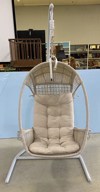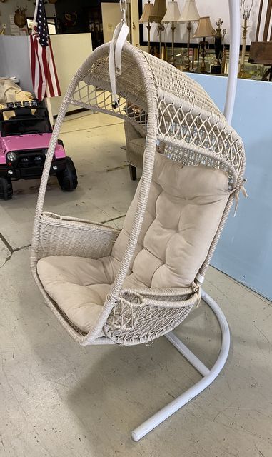 White Resin Wicker Hanging Egg Chair, lightly used, hanging chair with white metal stand. White Resin Wicker Hanging Egg Chair, lightly used, hanging chair with white metal stand.