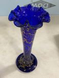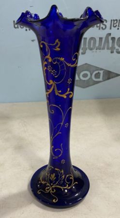 Blue and Gold Crimped Rim Vase, floral pattern, 12"h. Blue and Gold Crimped Rim Vase, floral pattern, 12"h.