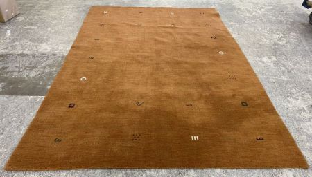 Woven Burnt Orange Area Rug, with white, green, accent shapes, good condition, 9'10 x 6'7. Woven Burnt Orange Area Rug, with white, green, accent shapes, good condition, 9'10 x 6'7.