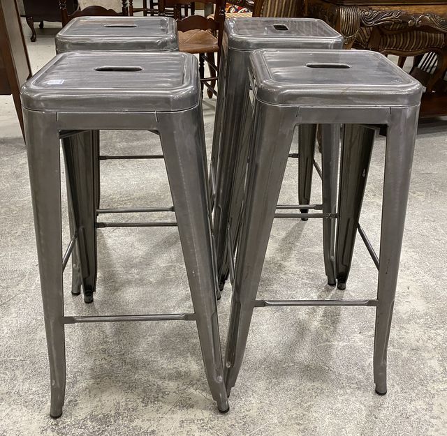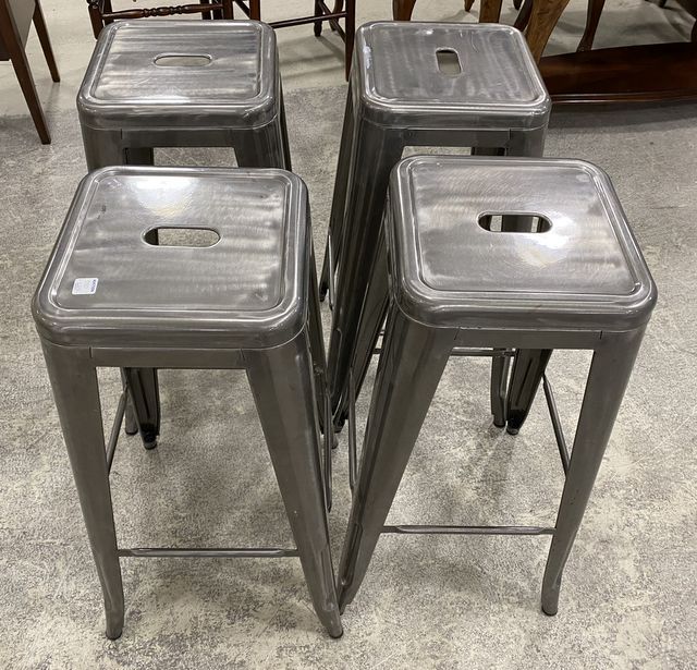 Four New Industrial Style Bar Stools, bare metal finish, handles, light wear, stackable, 30"h., 12"w. Four New Industrial Style Bar Stools, bare metal finish, handles, light wear, stackable, 30"h., 12"w.